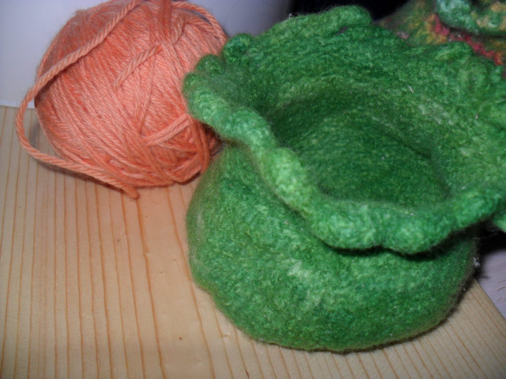 Some more Malabrigo green. I paired it with the rest of the rainbow yarn I'd won a couple of years ago from another blog. It was so pretty and with so little left, I knew it would be perfect here. I actually ran out near the bottom, which is all Dark Horse Yarn yellow. It felted great as a substitution, and the color is fine, especially since the bottom isn't seen. I'm thinking of using the last bit of yellow on another bowl I'm working on. I love how this pattern uses up some great wool and works up quick.
